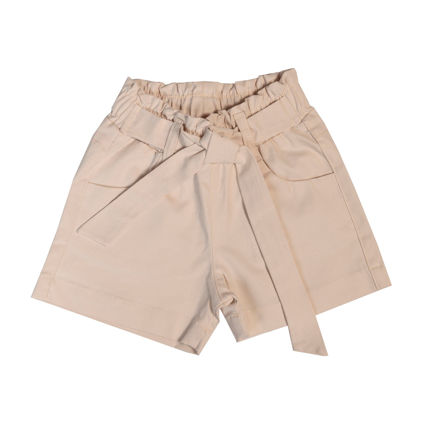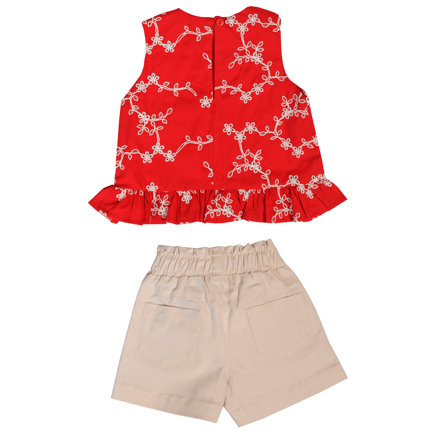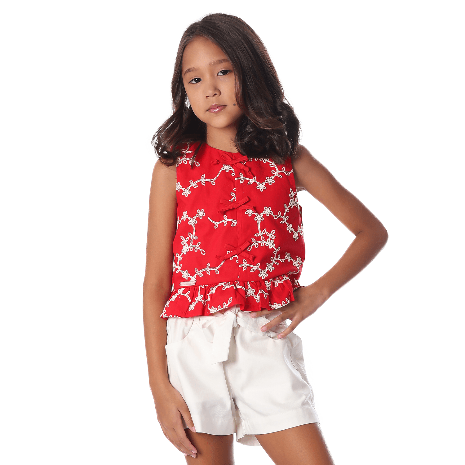 Conjunto infantil composto por blusa sem mangas com babado na barra e estampa delicada, combinado com shorts de cintura alta e amarração frontal. Contém: 1 Blusa e 1 Shorts.