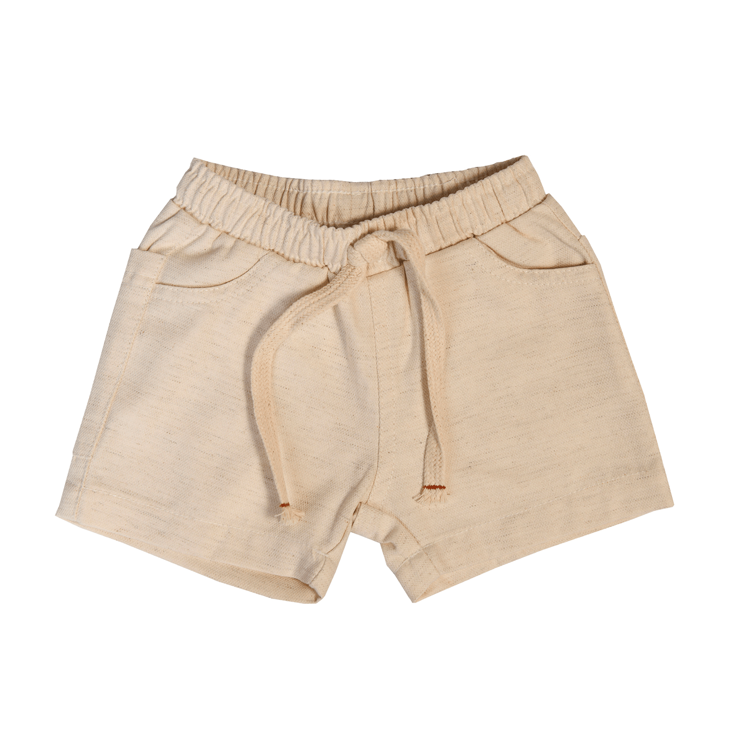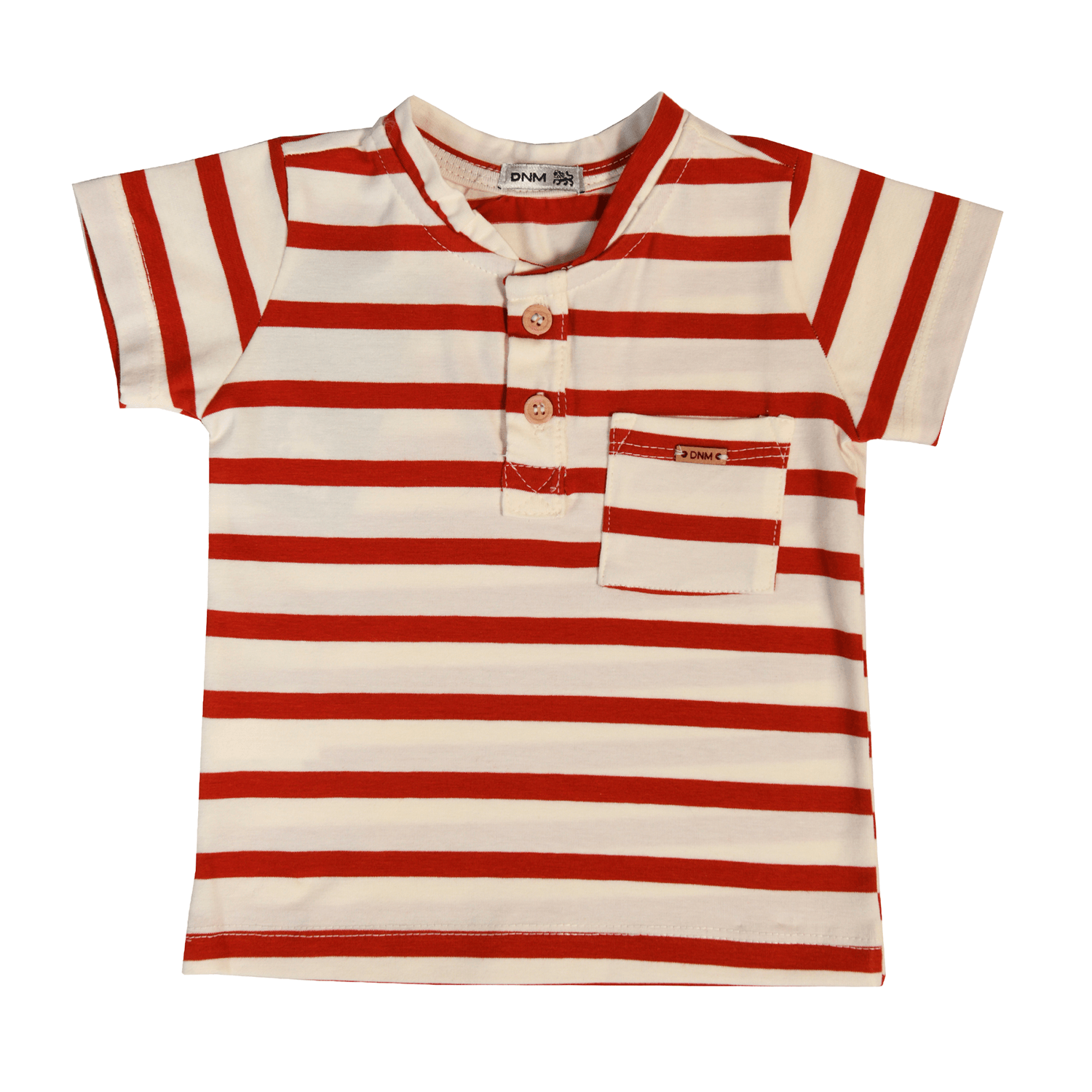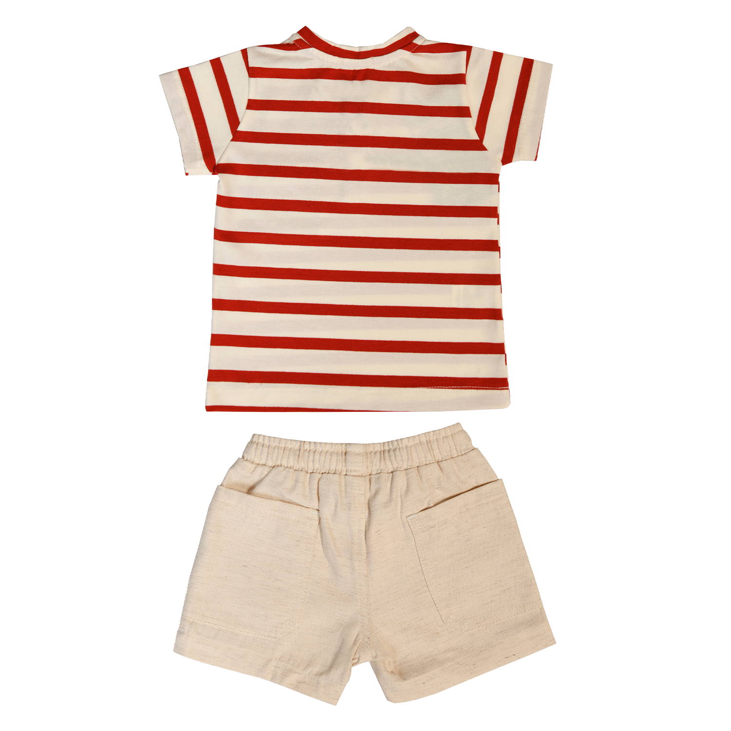 Conjunto infantil com camiseta listrada em vermelho e bege, bolsinho frontal e bermuda bege em tecido confortável. Ideal para momentos casuais com estilo e praticidade. Contém: 1 Camiseta e 1 Bermuda.