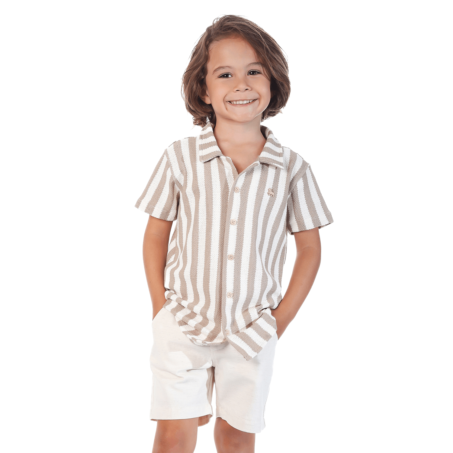Conjunto infantil composto por camisa listrada em tons neutros e bermuda bege, confeccionados em tecido leve e confortável, ideal para dias quentes com muito estilo. Contém: 1 Camisa e 1 Bermuda.